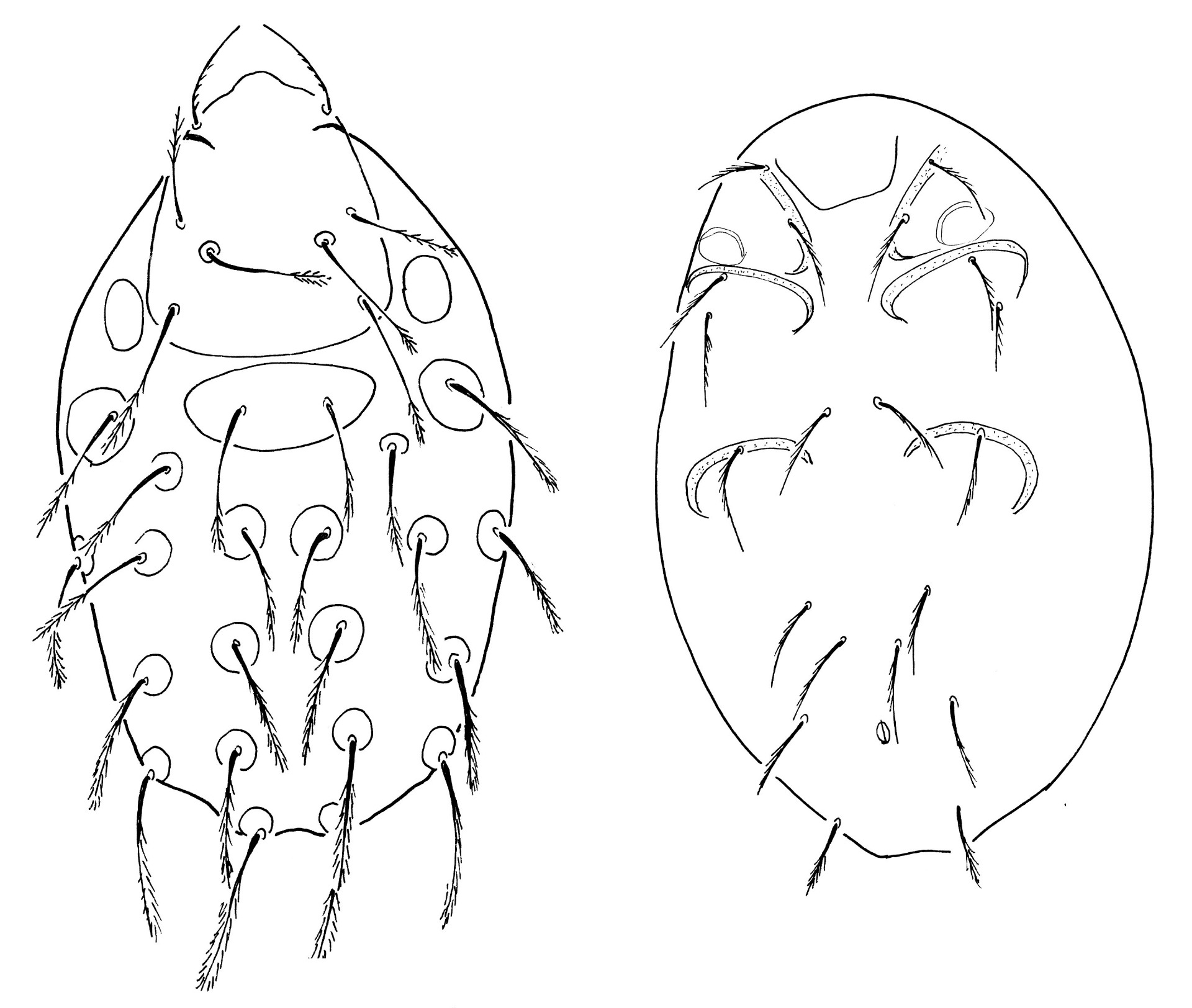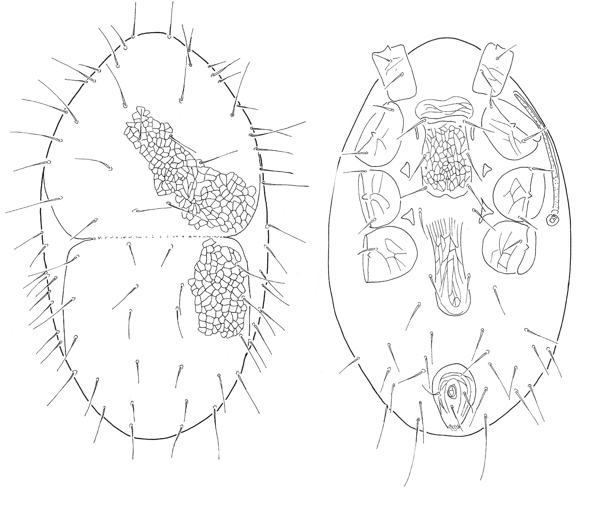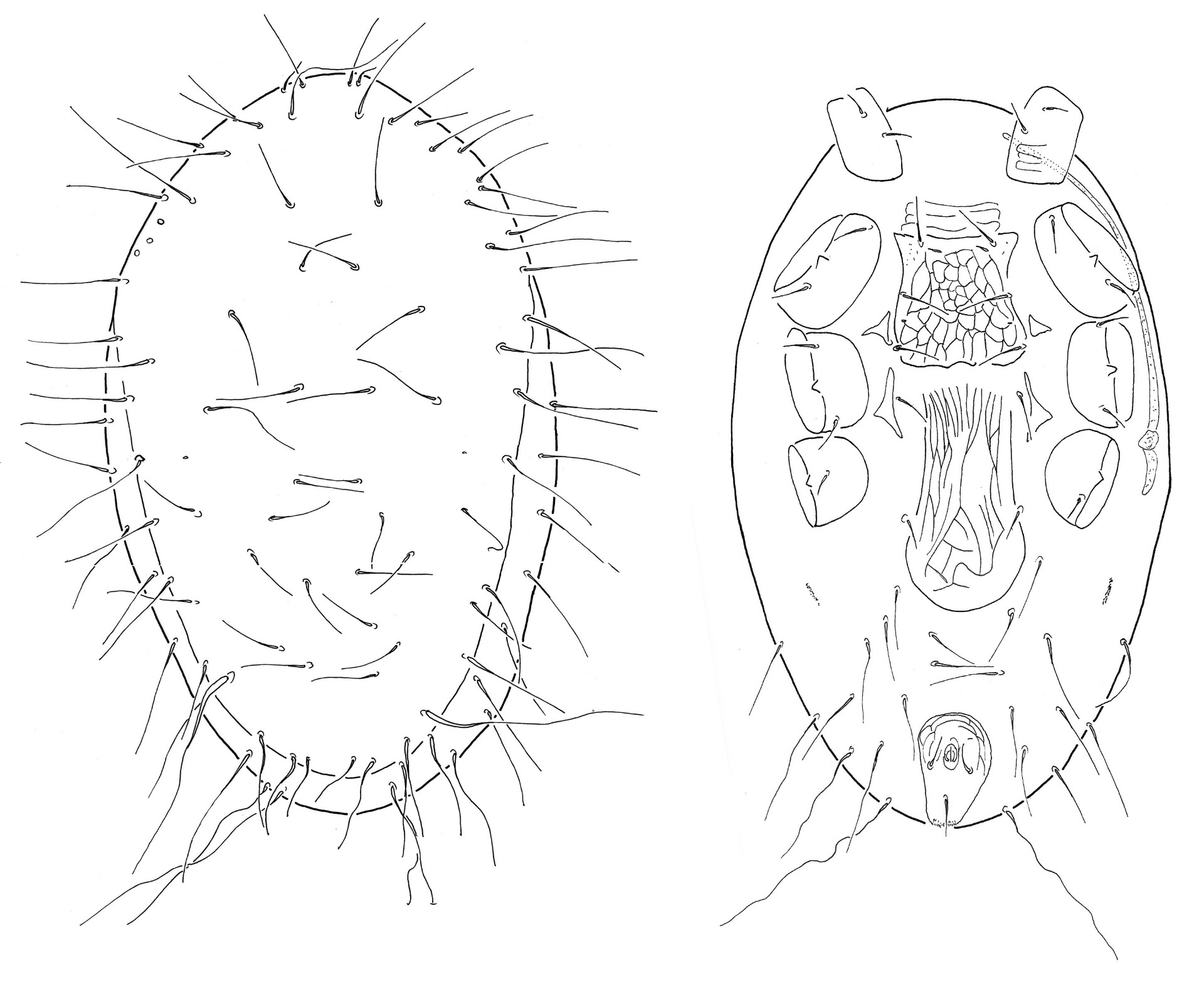 Rövid leírás: A dorzális lemezen bemélyedés nem figyelhető meg, a háti lemez egységes. A dorzális lemezen hosszú, tű alakú szőrök ülnek. A dorzális lemez felszíne sima. A dorzális lemez kaudális részéről és a körülötte lévő lágy kutikuláról hosszabb, hullámos szőrök erednek. A mell lemez, a nőstény ivari lemeze és az anális lemez hálózatos mintázatú. A nőstény ivari lemeze hosszú, kaudális részén kiszélesedik. A peritréma túlér az első láb csípőjén. A ventrális szőrök hosszúak, tű alakúak, az utolsó pár kaudális szőr nagyon hosszú és hullámos. Az episztoma fűrészes szegélyű. A 4. láb combján (femur) és a lábfején (tarsus) nagyon hosszú szőrök találhatóak.