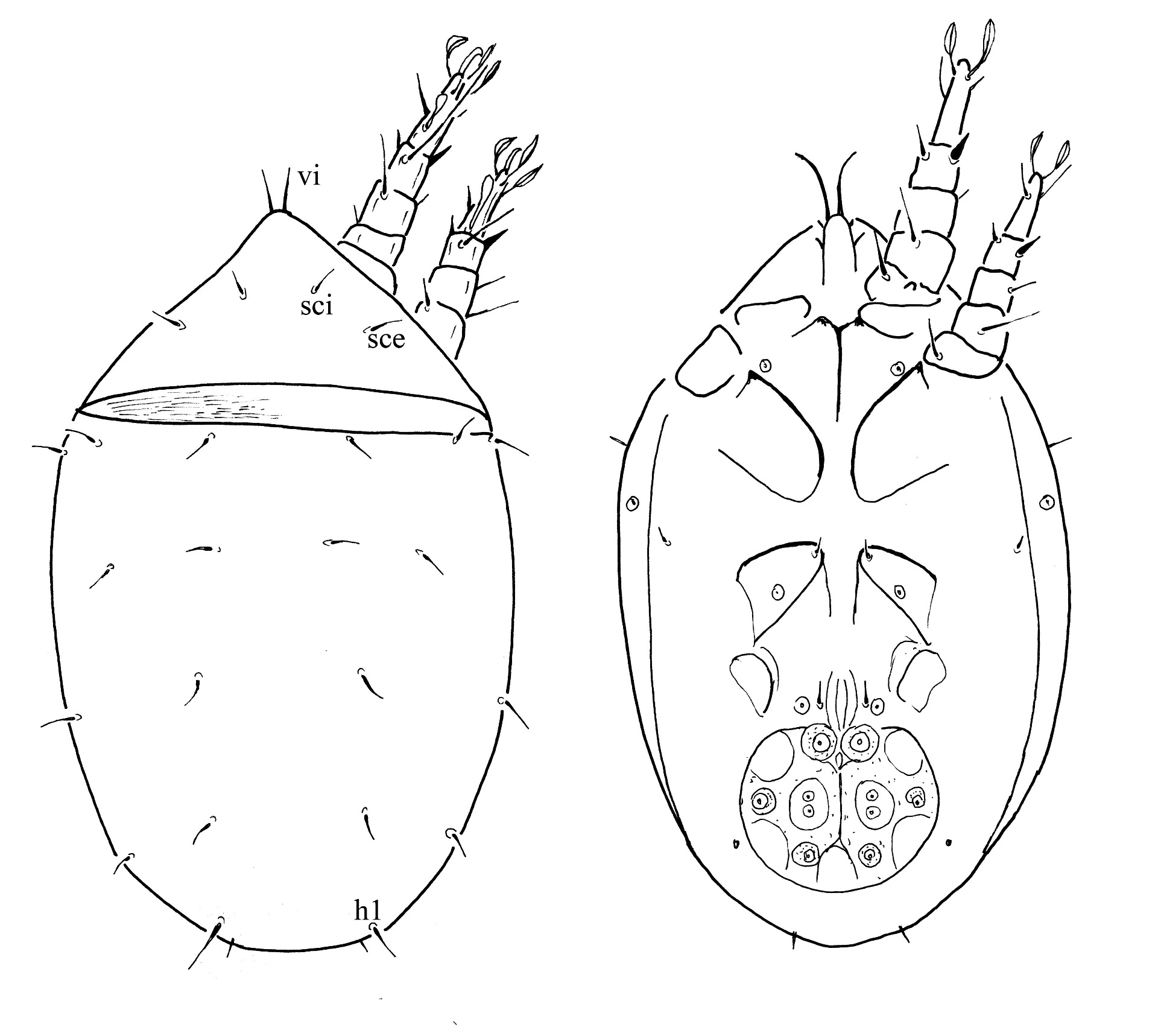 Rövid leírás: Kicsi, világos, domború atka. A háti lemez két részre osztott. Az elülső lemezen három pár tű-alakú szőr van, míg a hátulsón 10 pár. Az első epimerális barázda Y-alakú, a második nem zárodik, míg a harmadik és a negyedik gyengén fejlett. A szívólemez nagy.